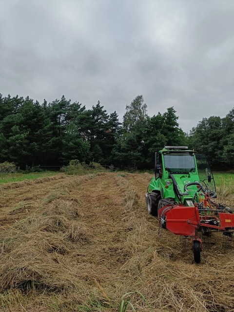 Niiton jälkeen kuivunut heinä saadaan niittokoneeseen kytketyllä ketjuharavalla karhoihin ja edelleen läjitettyä. Koko koneketju saadaan kuljetettua yhdellä peräkärryllä kohteelle tai tarvittaessa vaikka keularampillisella veneellä.